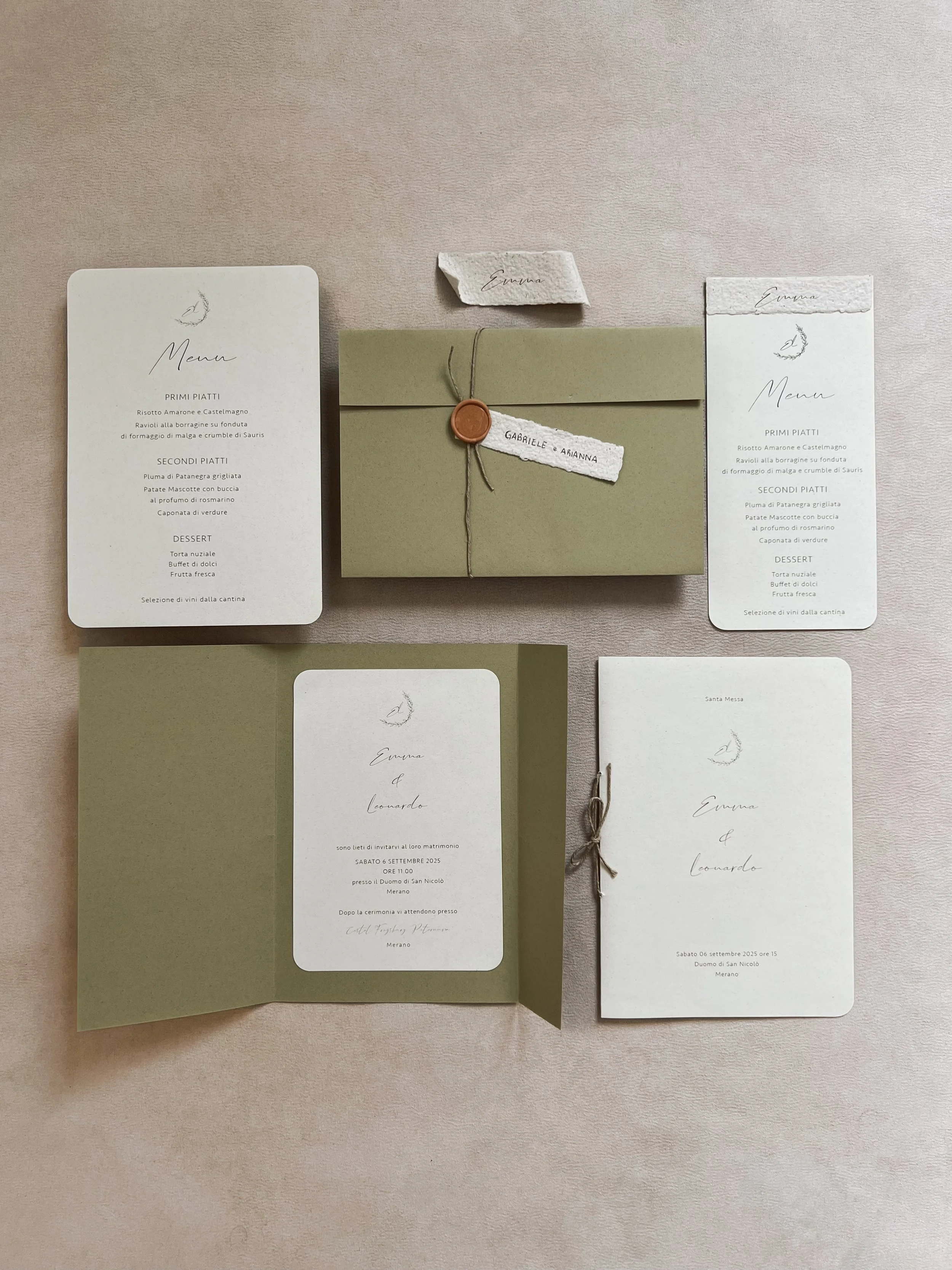 invito in carta riciclata oliva con chiusura ad aletta con spago e sigillo variegato mattone-avorio con interno in carta riciclata avorio