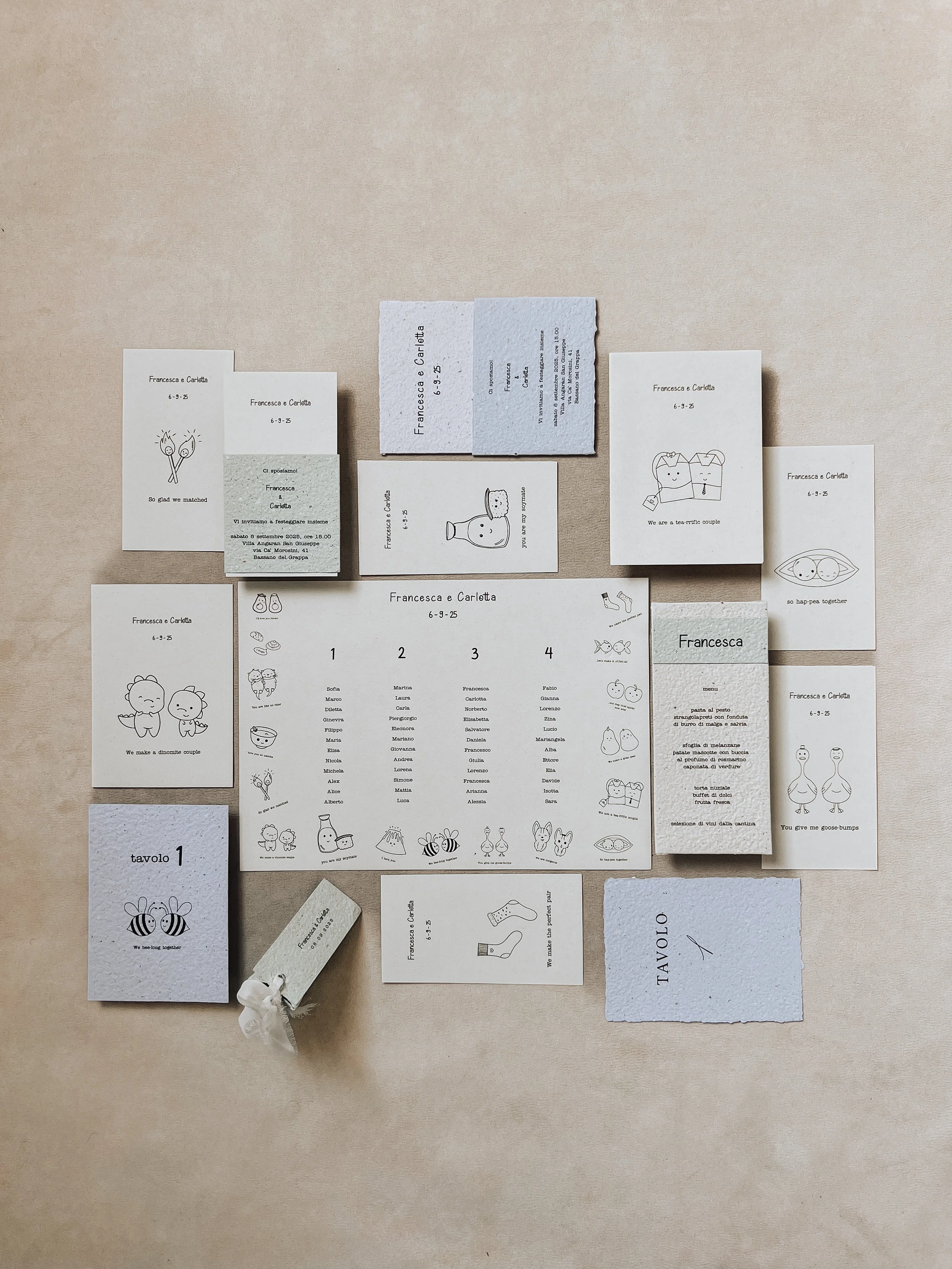 Assolutamente no. Un modello può essere un punto di partenza da cui partire per realizzare un coordinato personalizzato. Si può fare delle aggiunte, come il logo della coppia o una decorazione floreale, oppure cambiare il font o la posizione degli elementi.