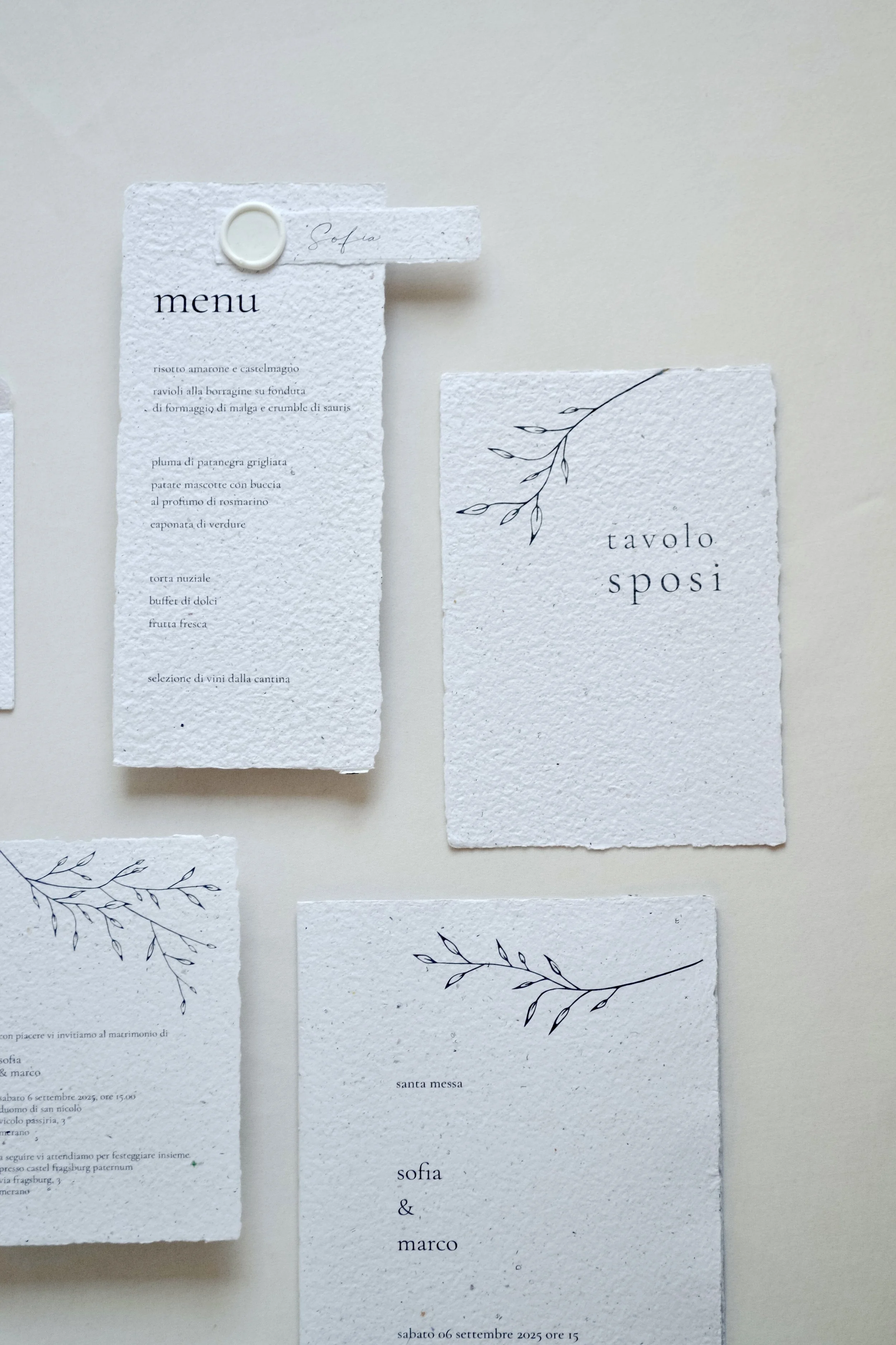 Stampato su carta fatta a mano e vellum, con un motivo floreale che si ripete sui sigilli. Un coordinato per chi cerca unicità e coerenza in ogni dettaglio.