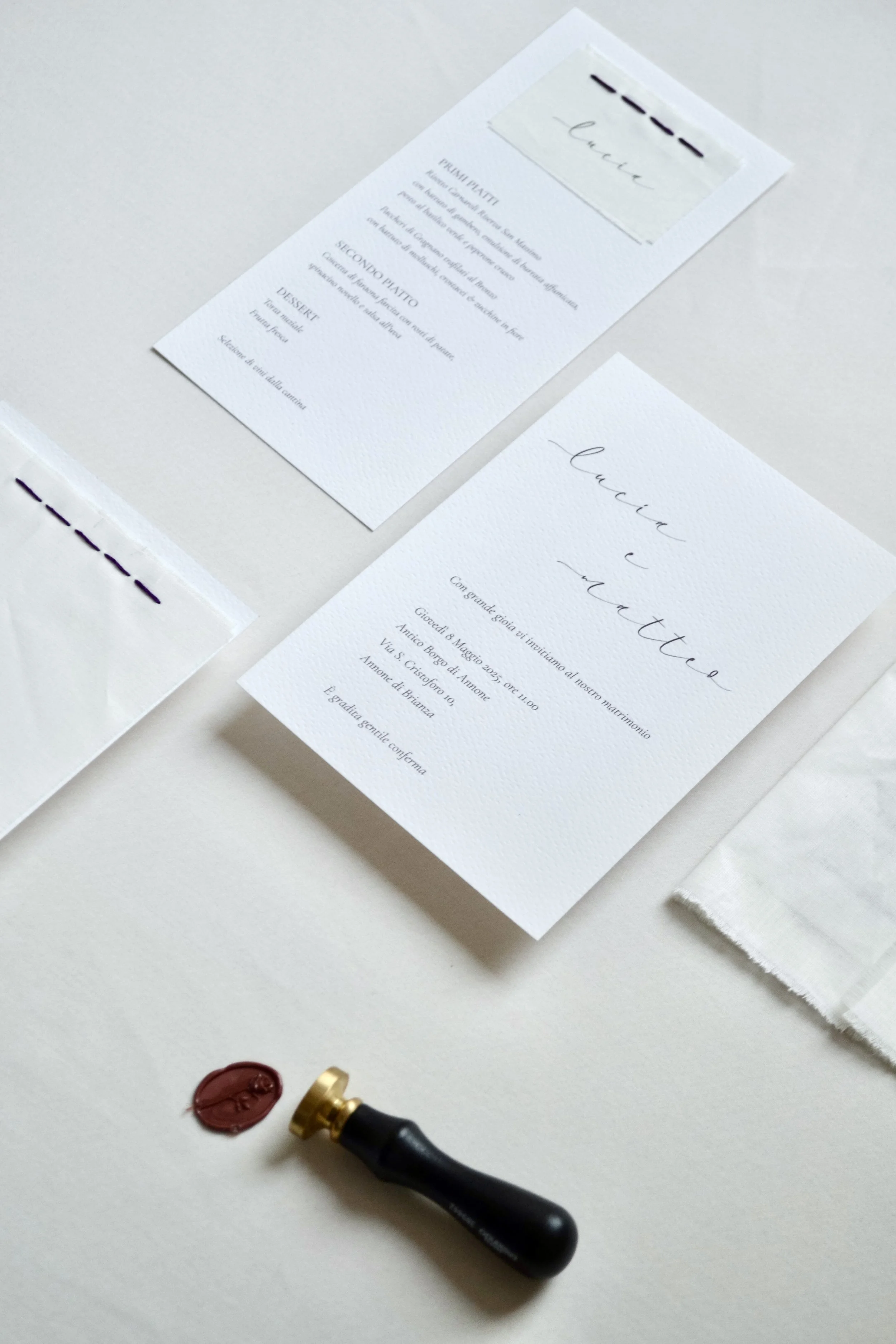 La tipologia di carta, la forma della busta e dei vari elementi, sono tutti fattori da decidere insieme. Il "modello" si riferisce esclusivamente alla parte grafica, non alla scelta del materiale.