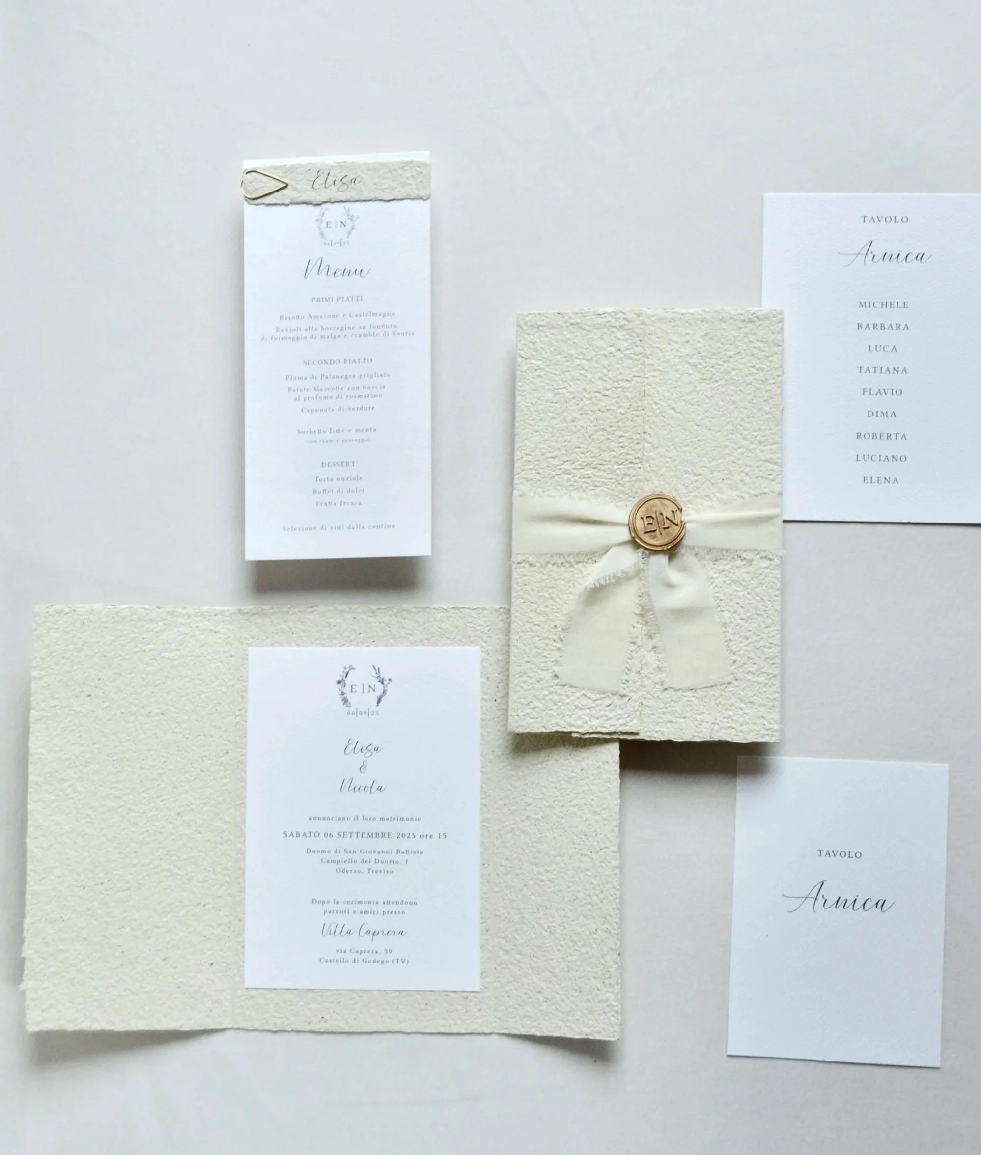 Ispirato alla campagna, semplice ma ricco di carattere. La carta fatta a mano e i dettagli rustici lo rendono perfetto per chi ama la naturalezza e la genuinità.