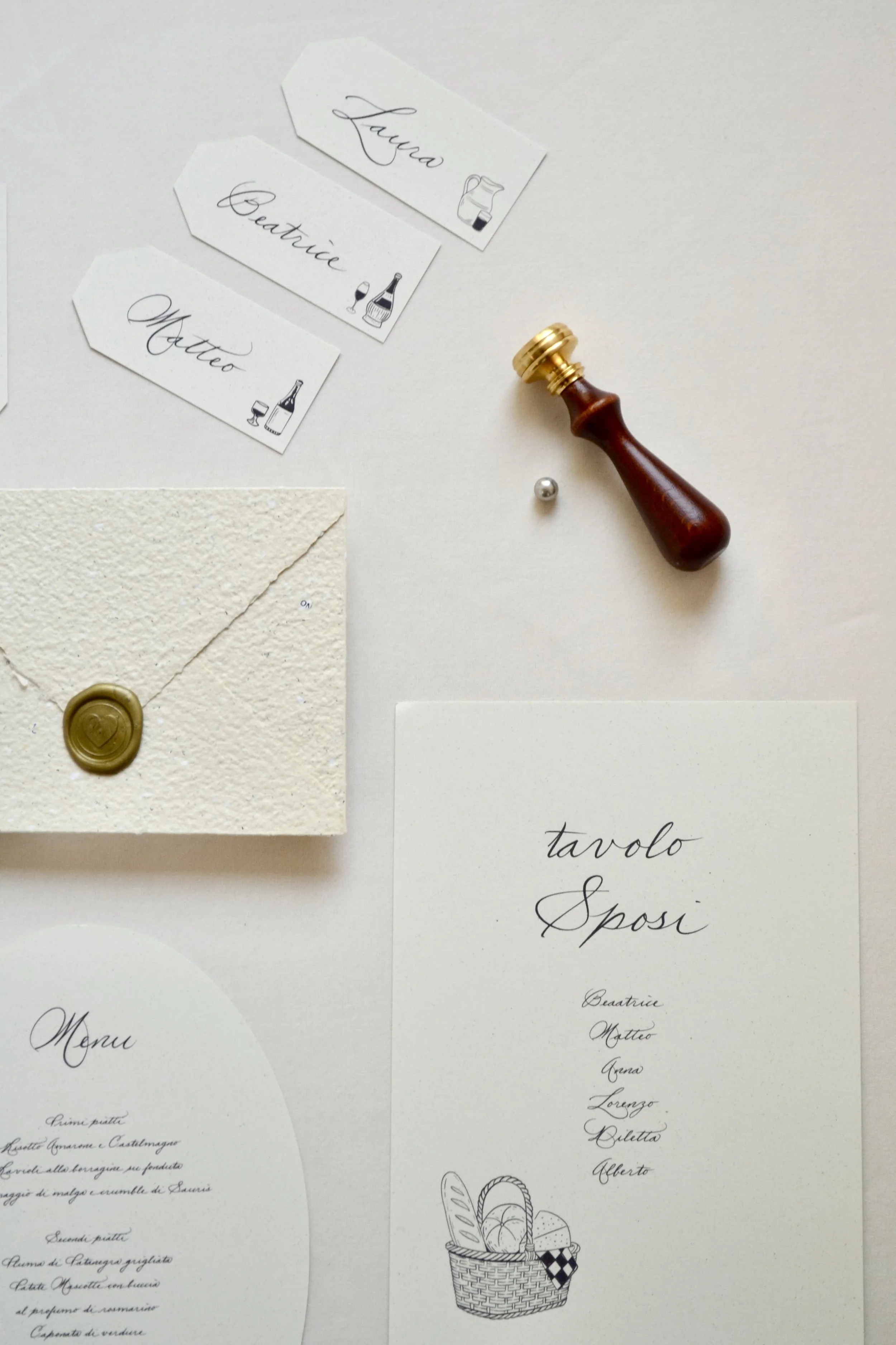 Giovane e fresco, sostituisce il classico sigillo con una fascia in carta fatta a mano, personalizzabile con il nome dell’invitato. Un tocco giocoso che ritorna anche nel menu.