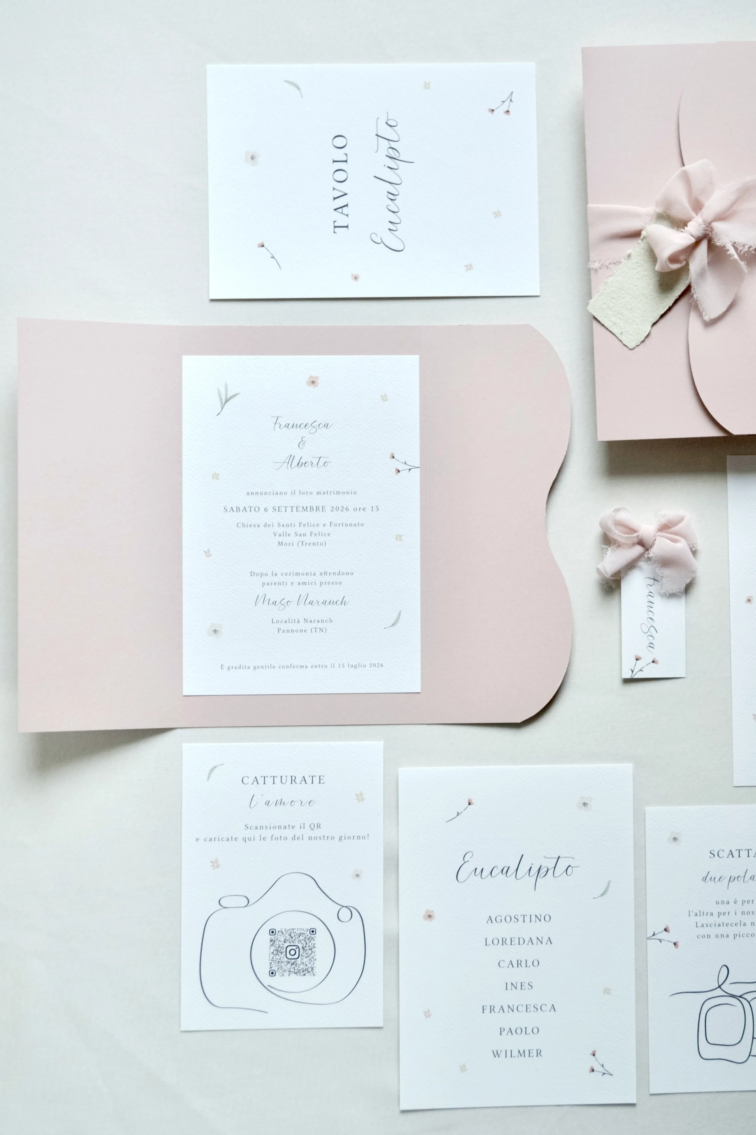La collezione 2026 comprende 18 modelli, ciascuno studiato per adattarsi a una diversa tipologia di cerimonia, location e stile, spaziando dal più campestre al più elegante. Ogni modello può essere scelto nella sua versione originale oppure rappresentare un punto di partenza personalizzabile in ogni dettaglio: dal carattere tipografico al tipo di carta, con la possibilità di optare per carta fatta a mano, selezionare i colori e aggiungere disegni personalizzati per rendere unica la vostra partecipazione.