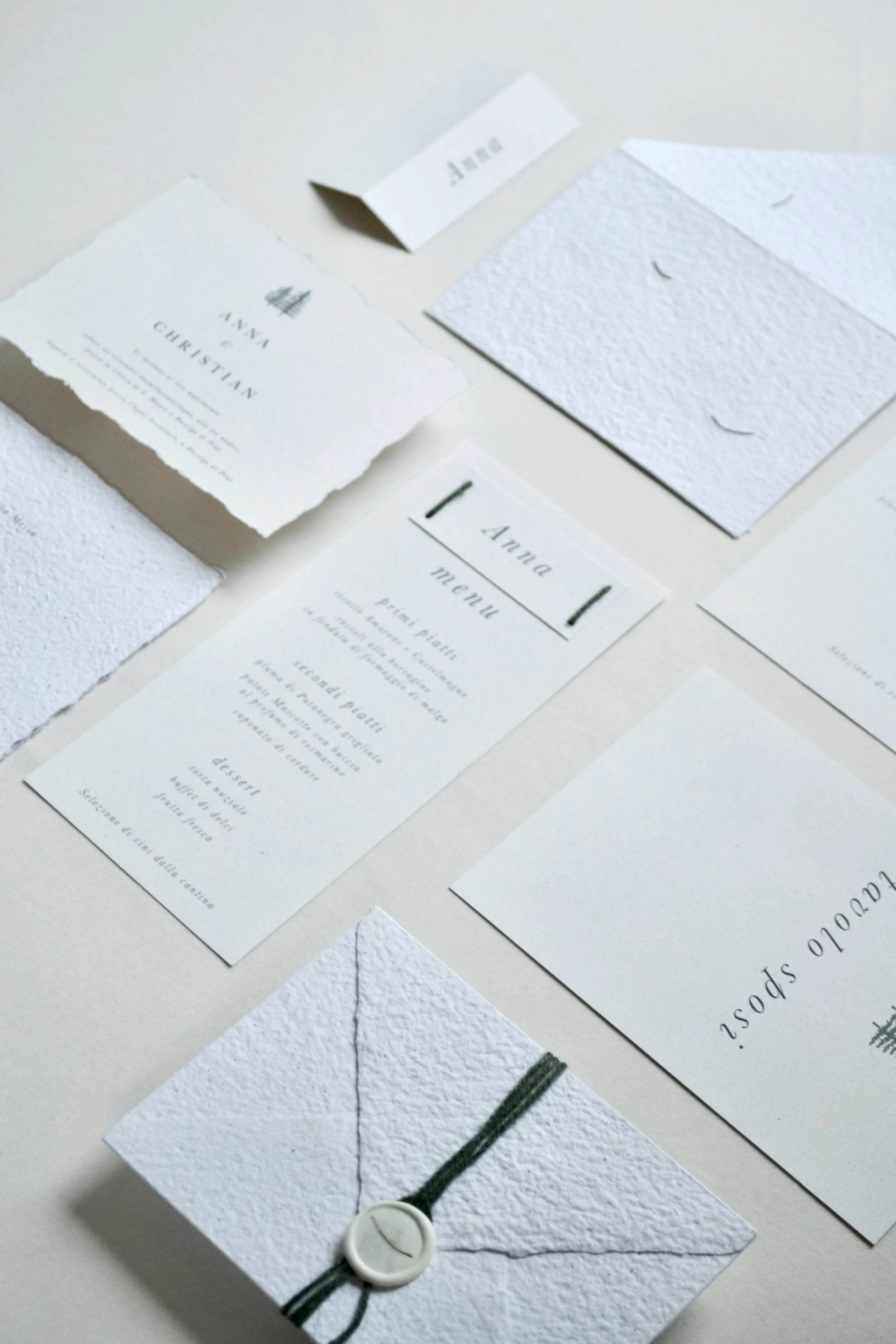 Essenziale e dal gusto nordico, questo coordinato unisce minimalismo e natura. La busta racchiude veri aghi di pino, sigillati con un filo di lana, per un tocco autenticamente montano.